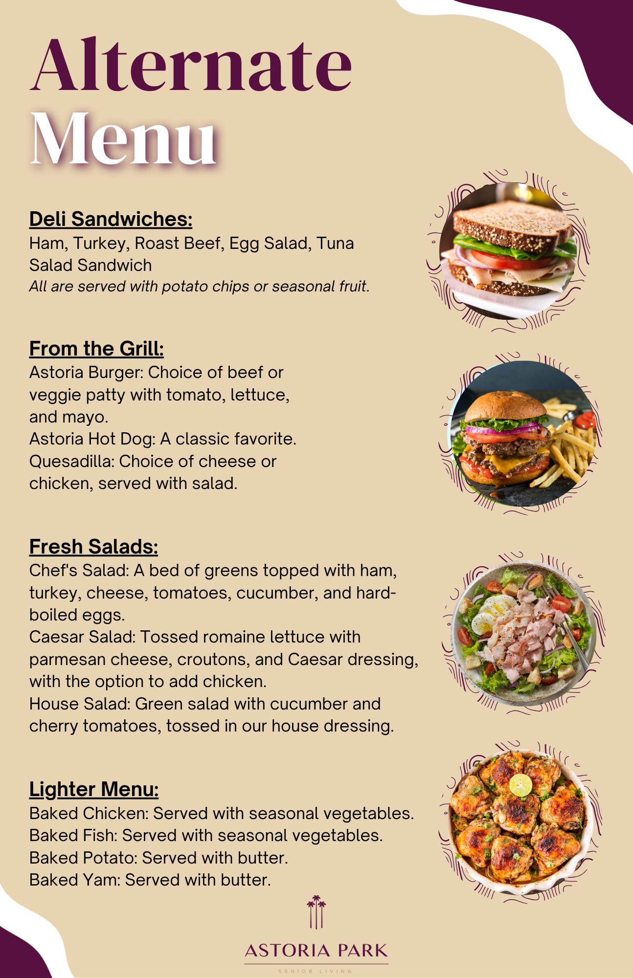 Our chef, renowned for their culinary skills, brings a wealth of experience to Astoria Park. They have a unique talent for blending traditional recipes with innovative techniques, resulting in dishes that are both familiar and exciting. With a deep understanding of nutrition and flavor, our chef ensures that every meal is not only delicious but also tailored to support the well-being of our residents.